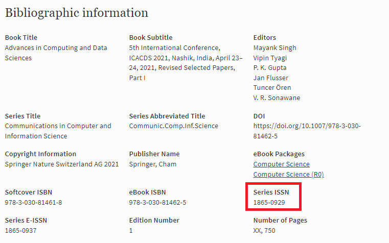 From the Journal or Conference website or earlier publication page, please find the Journal ISSN Number [ eg. ICACDS Previous Publication - 2021]